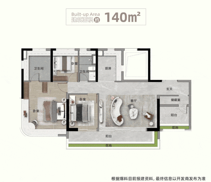保利四季和颂设计了四个户型,其中大的户型建筑面积约140㎡,尺寸拿捏得非常到位,并不超豪宅线。