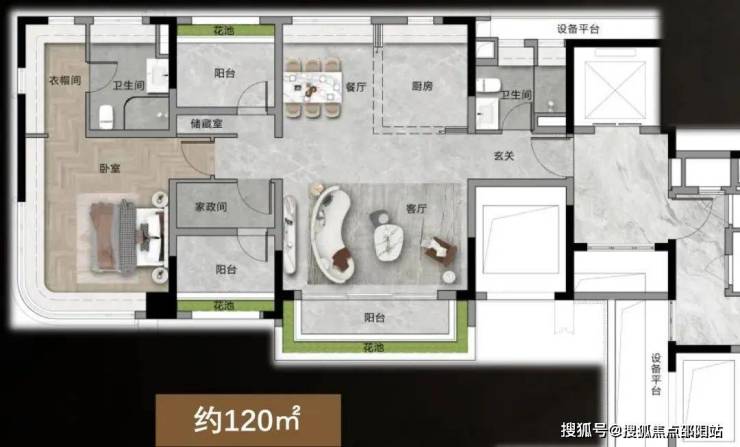 建面120㎡户型则是更升一级的1+3房设计,南北对流,更加通风,更难得的是,该户型是4.5开间朝南,阳台视野也更加开阔。
