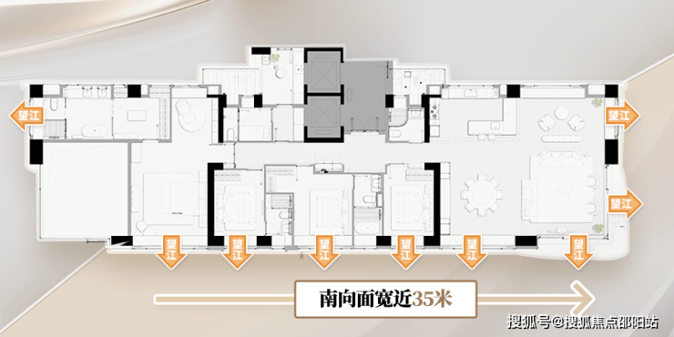 以建面约235㎡户型为例,南向面宽足有约23米,从客厅、餐厅、卧室,甚至衣帽间都采用大面积玻璃窗,极致的窗墙比,专属顶豪的上层揽景视野。