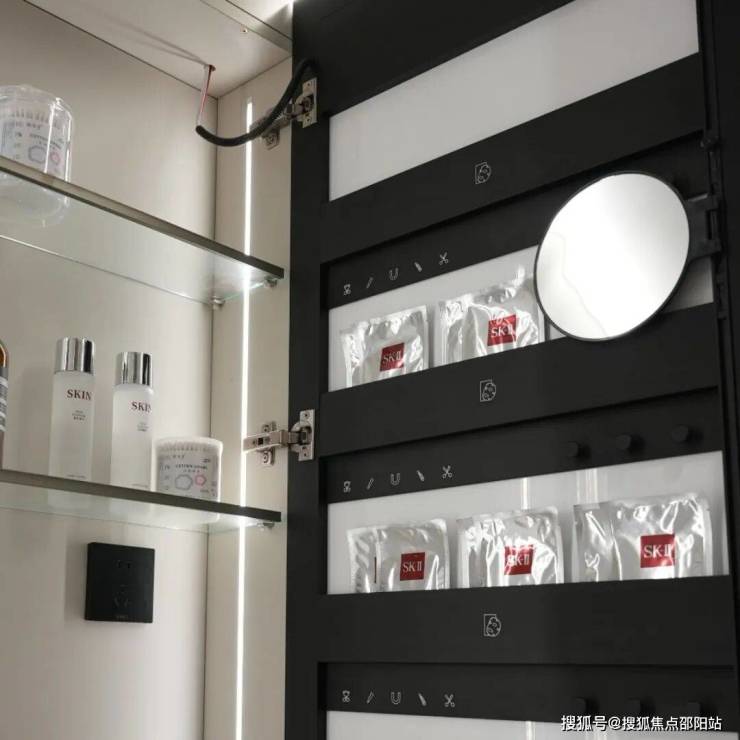 在卫浴空间,美妆收纳背柜的设计,让所有的美妆工具都能有序存放,女主人每一次的打扮都更加得心应手。