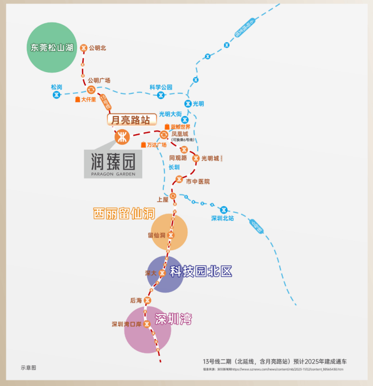 交通配套:润宏城家门口是主干道松白路,自驾半小时可达南山,周边还有南光高速、龙大高速、深圳外环高速等交通要道,13号地铁线”月亮路站“距离约300米,目前还在建设当中,预计在2025年底-2026年初开通运营,1站直达凤凰城换乘6号线,3站至光明城高铁站,未来通过13号线可快速连接南山科技园、后海总部等核心区域,未来该线路将延伸至东莞松山湖,并接驳29号线(规划中),形成大湾区黄金轴线。