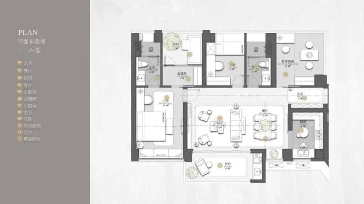 135㎡的3房2厅2卫,135㎡三房两卫,横厅格局,南北双阳台设计,9.8㎡南向主阳台,三个房间面积分别达到9/11/15㎡,主卧带衣帽间和卫生间,舒适度非常好。