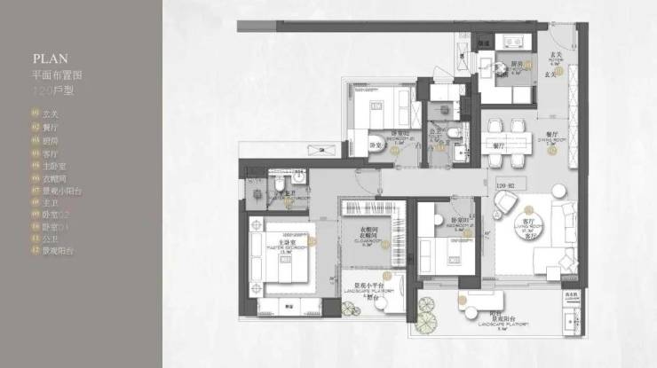 120㎡的4房2厅2卫,竖厅格局,客厅与卧室连通9.6㎡超大阳台,主卧带5.2㎡衣帽间,还有观景小阳台,主要为东南和西南朝向。