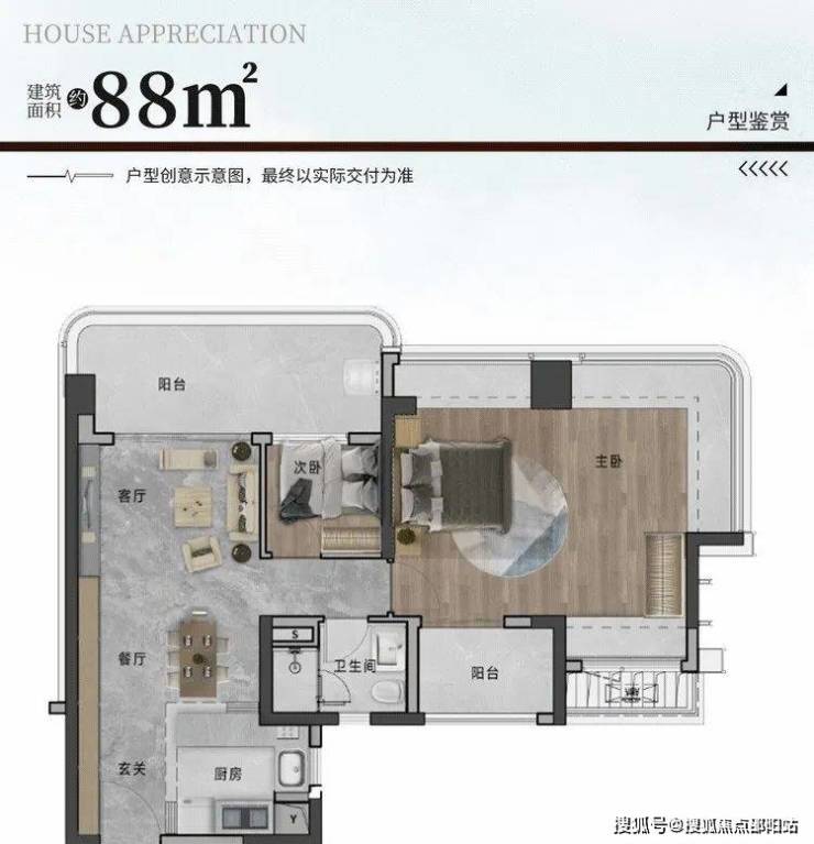 建面88㎡三房,LDKB一体化设计,约5.7米的宽景阳台,另外还有270°的环幕主卧。