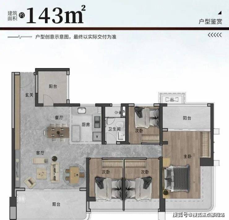 建面143㎡五房,四开间朝南设计,约36.5米的采光面,视野景观一流,而且大阳台以及大飘窗都是标配。
