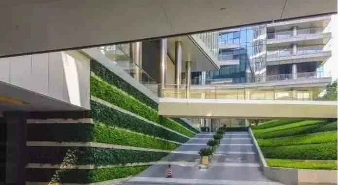 高层区地下车库入口景观,坡道空间通过设置廊架及绿化围合,形成富有层次、绿化掩映的地下车库入口景观。
