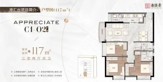 117㎡三房两厅两卫,阳台飘台视野广,无界风光,主卧奢配衣帽间,私藏优雅双阳台向阳,美景釆光入室,客卫三分离设计,井井有序