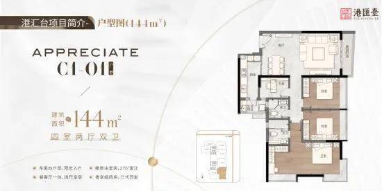 144㎡四房两厅二卫,东南向户型,阳光入户,瞰景主套房,270度望江,餐客厅一体,阔尺享受,奢享级四房,三代同堂