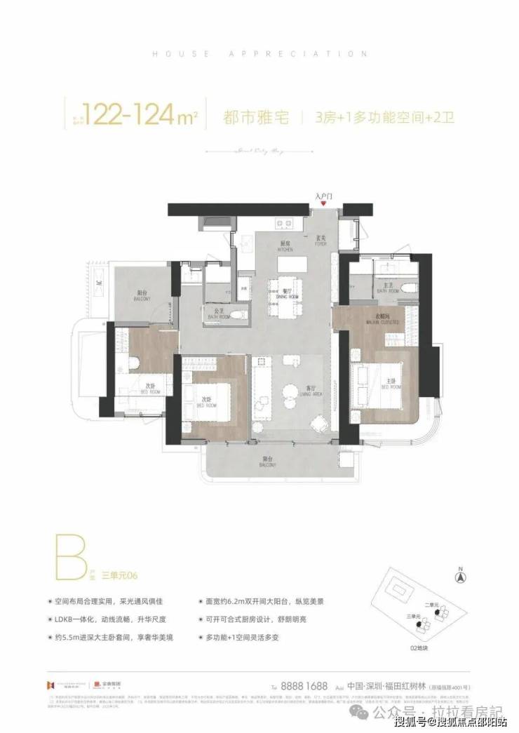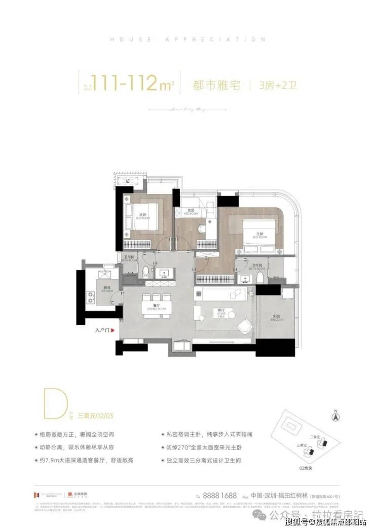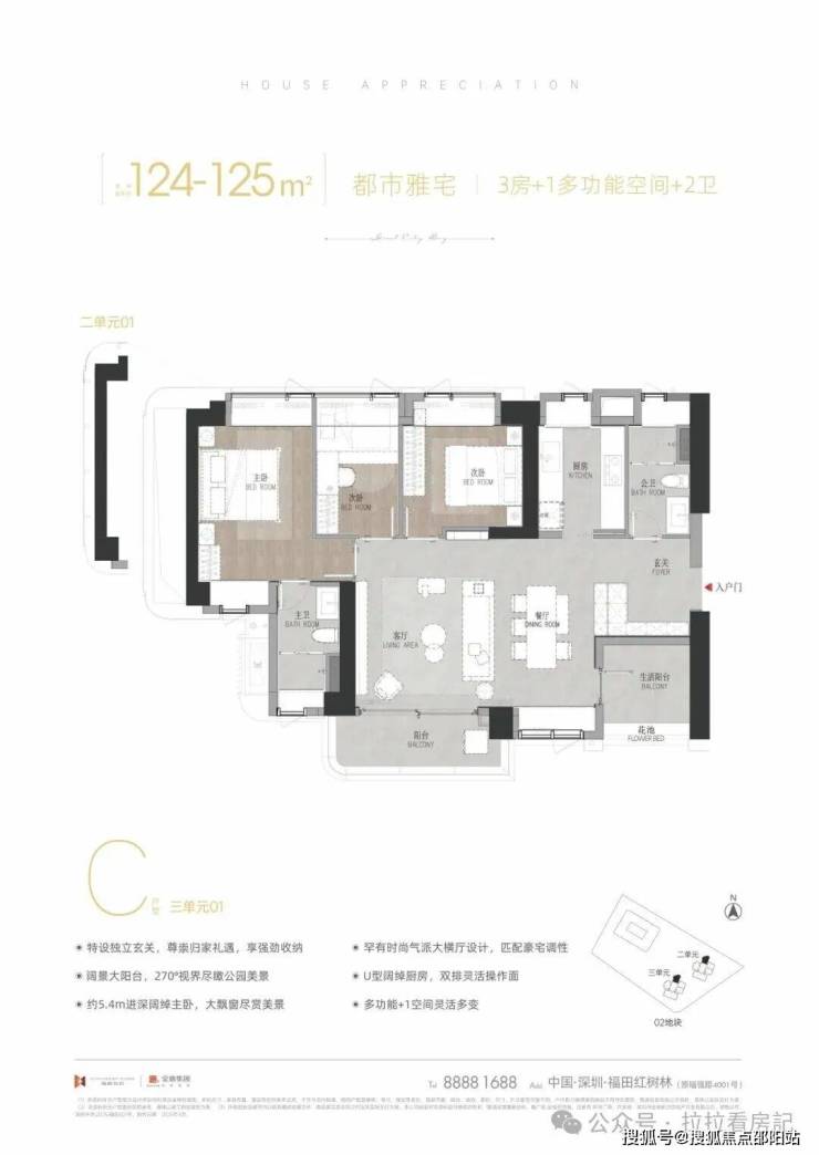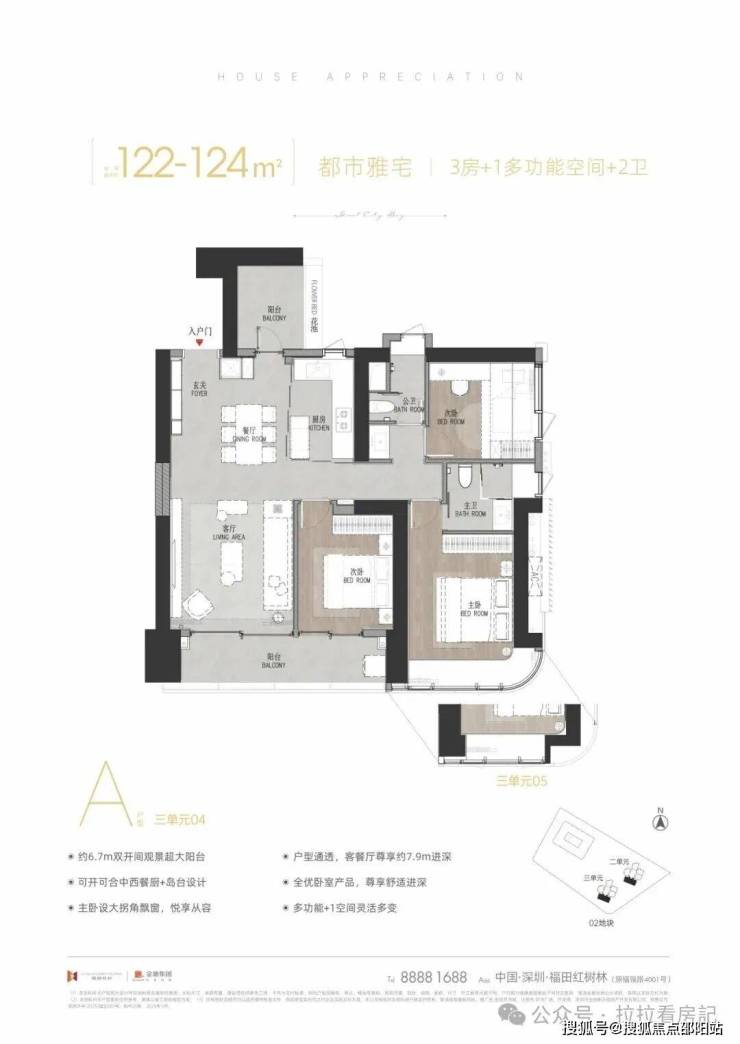 其中,建面约111㎡3房2卫户型,全明格局、动静分离,配置270°全景大面宽采光主卧,独立高效三分离式卫生间设计;建面约125㎡3房+1多功能空间+2卫户型,独立玄关、阔景阳台,部分户型还享大横厅设计和270°大拐角飘窗,视界尽瞰湾区海景。