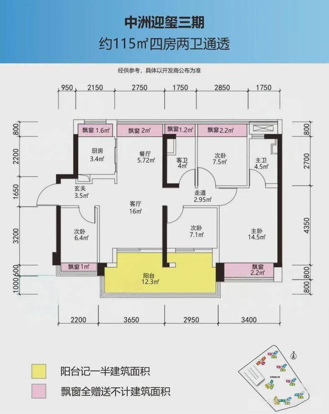 115㎡的4房2厅2卫,设计的是竖厅南北通透格局,进门入户玄关,客厅3.65米开间,LDKB一体化设计,四开间朝南,4个卧室分别做到了主卧16.7㎡/次卧9.7㎡/次卧7.4㎡/次卧7.1㎡(包含墙体飘窗),客厅连接次卧出6.6米长的大阳台,U型厨房,卫生间干湿分离,赠送面积高达16.35㎡,阳台主朝正南或东南向。