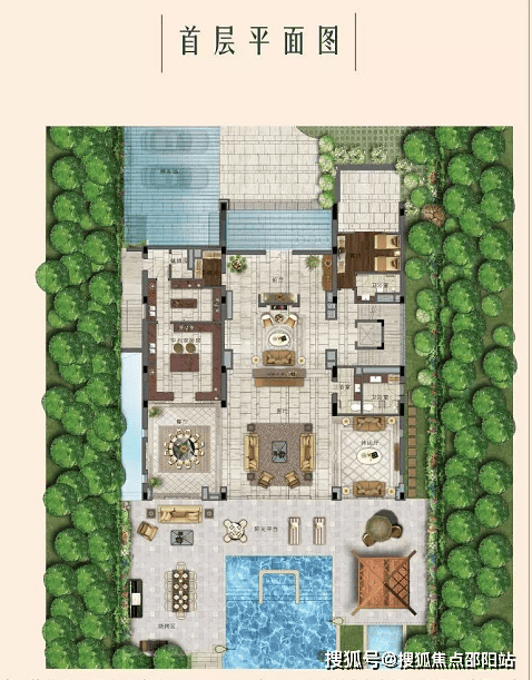 私家超大泳池,草坪活动区域,阶梯式园林分布合理规划园区