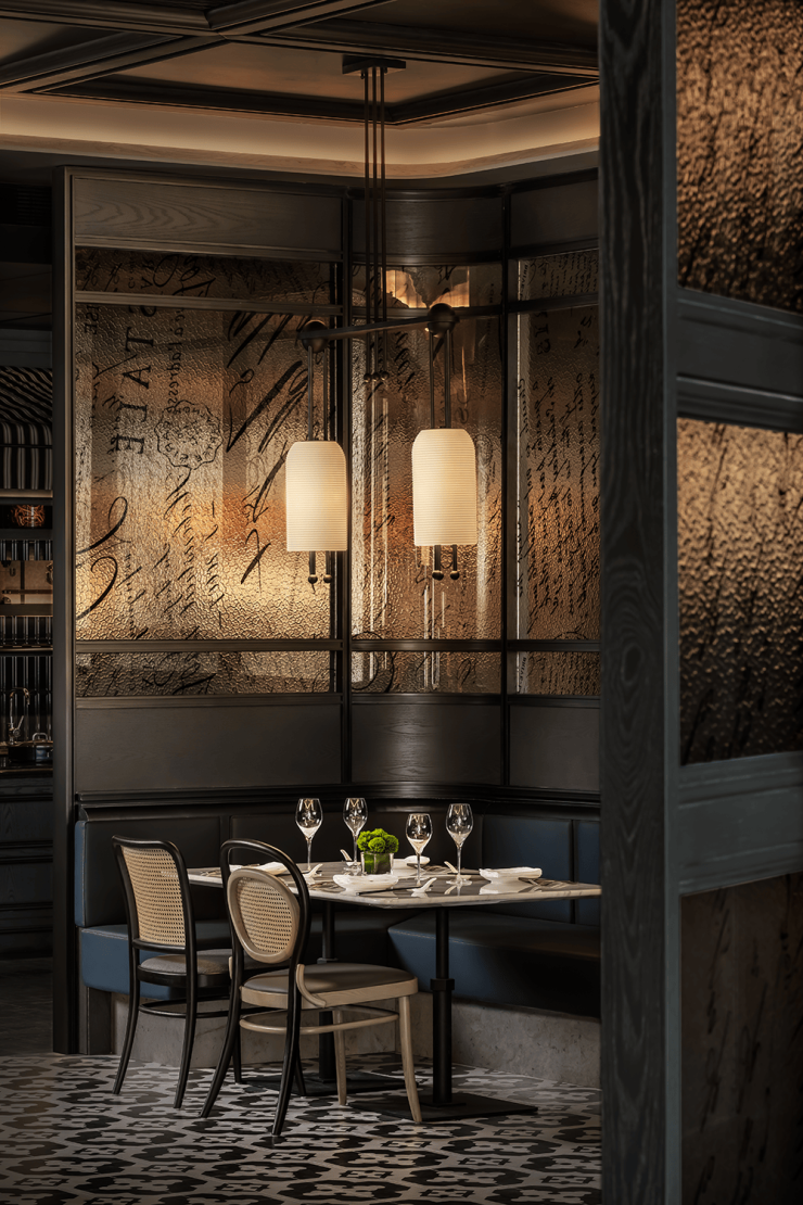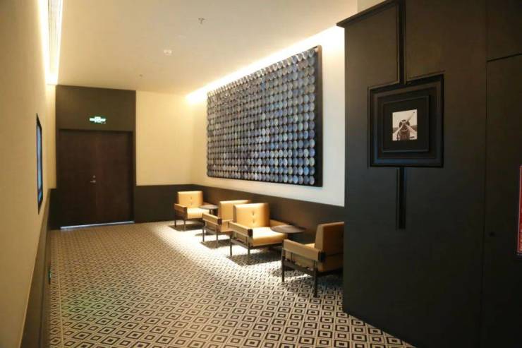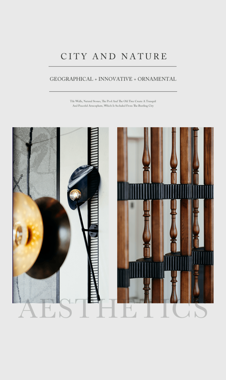 接待大堂的古典又现代的柱廊,造型简洁的天花呈现立体阵列状,无明显的中式符号,却显现出东方的庄重大气。地面法式的鱼骨纹拼接木地板,强化了空间视觉上的延伸感。吊灯、地面拼花、屏风及装饰画等元素的巧妙搭配,增添了空间的艺术气息,散发着独特的中法整合魅力。