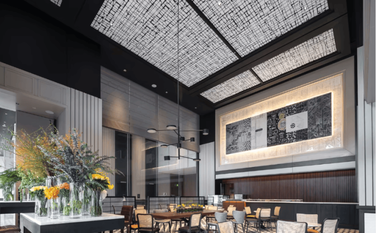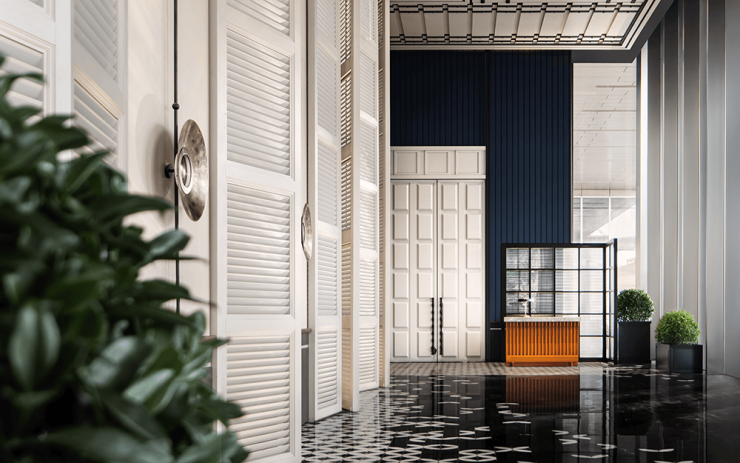 深圳前海华侨城艾美酒店是深圳首家艾美酒店,设计以欧式慵懒假日为灵感,融合岭南文化,让入住的每一位顾客享受假日般的惬意时光。酒店首层大堂以“ 浪心古城”为主主题,设计元素在使用了经典的法式线条的同时,配以嶺南元素,整体色彩以艾美65%的黑白灰为色调展开,仿如穿越至岭南古城的街角。