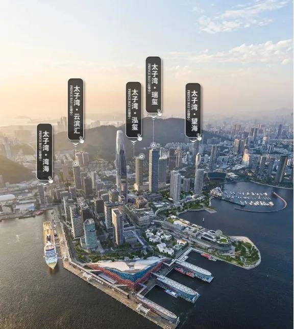 太子湾片区规划总建筑面积约170万㎡,总占地约69万㎡,汇集办公、居住、商业、艺术中心、酒店等多元业态。以“一湾三坊城中城”概念打造布局,在独一无二的太子湾滨海区,汲取山、海、城三大元素,构建高端“居住坊”、“商业坊”、“港务坊”。凭借独树一帜的规划与强大的枢纽功能,成就高端元素集萃纷呈的“城中之城