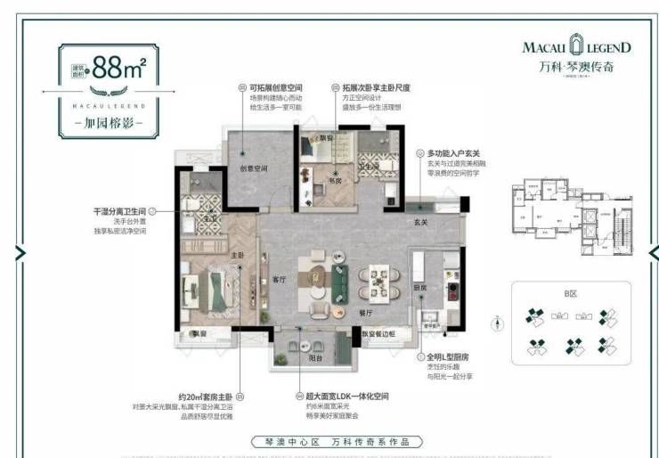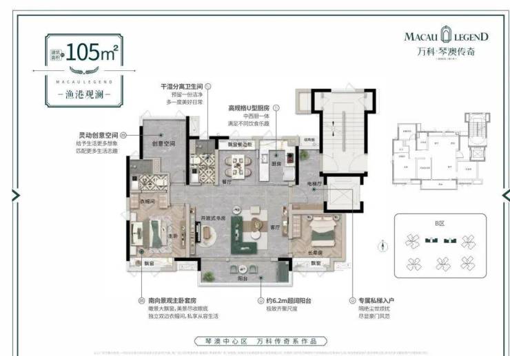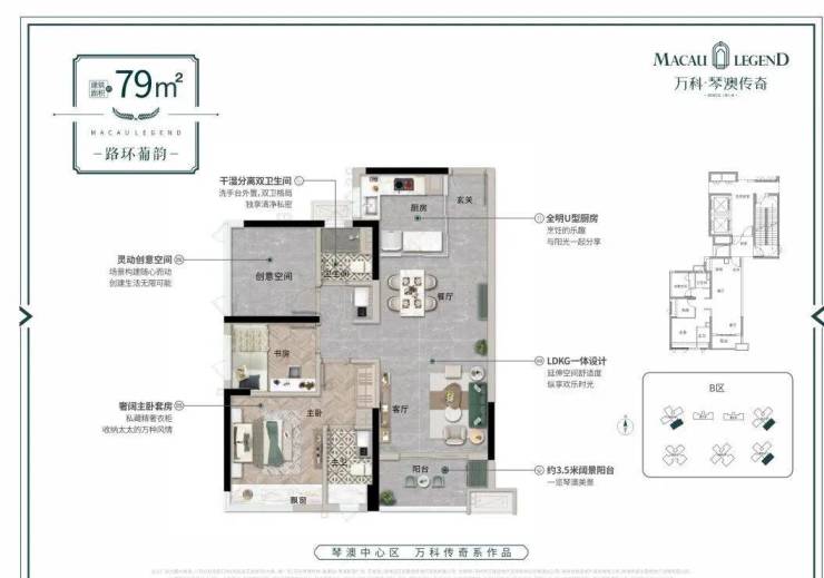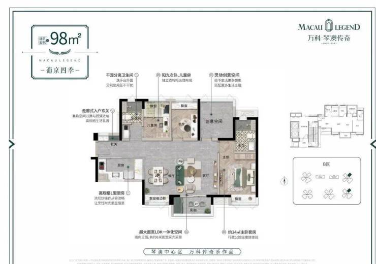 万科传奇是首进珠海的项目,将以澳门妈阁文化为基调,从建筑风格、社区打造到招商运营等方面,将打造成澳门风情综合住区。项目地处规划中的珠海城市新中心核心区——横琴一体化片区(保税区),坐拥交通枢纽中心、金融中心、会展中心、商务中心、生态中心等千亿级高端配套,并且是片区内目前第二个纯住宅项目,成就了它本身的稀缺性项目占地约6.68万㎡,总建面约20.73万㎡,将建设成为一个高品质人居标杆的国际住区。2.2的低容积率,在土地资源稀缺的一体化区域内可谓“大手笔”,将为每一个户型带来上佳的采光通风。万科成立于1984年,世界500强名企,坚持打造“好房子、好服务、好社区”的三好住宅2006年万科地产入驻珠海,深耕珠海13载,以卓越品质和精诚服务打造珠海10余个标杆项目。同时,被市场誉为“金牌管家”的万科物,为业主提供全生命周期服务,实现“人、财、物”的全面数据化管理,为阳光社区、透明物业奠定了扎实的互联网基础,帮助业主解决数以万计大小事务,24小时贴心守护,全维照护居者生活