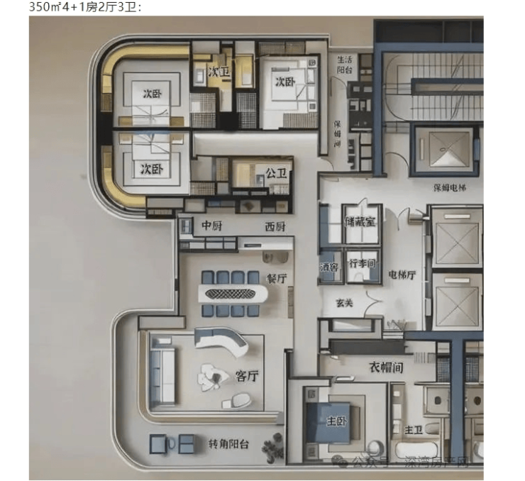 :计容建面15.6万㎡,共419套,含195㎡、285㎡、350㎡、495㎡四大户型,层高43-54层,梯户比最高达3梯1户(顶豪专享)。