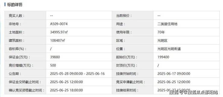 去年(6月27日),光明中心区宅地(宗地号A509-0074)由深振业、天健、深建辰投资联合体以底价19.94亿竞得。成交楼面价18380元/㎡。