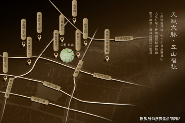 ·景观资源:山顶公园、火炉山、华南植物园、汇景高尔夫满足社交娱乐等