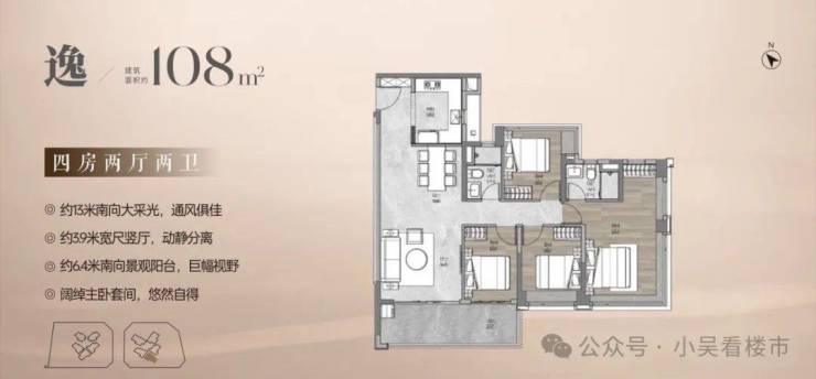 建面108平四房两卫,约13米南向采光面,通风俱佳,客厅开间3.9米,动静分离,约6.4米景观阳台,主卧套间设计。