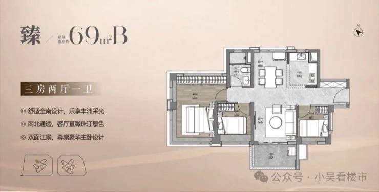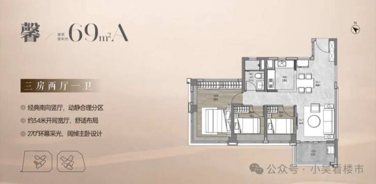 建面69平A户型,经典南向竖厅户型,厅出阳台,约3.4米客厅开间,四开间朝南,三间卧室都是南向,北向都是卫生间,主卧270度环幕采光。