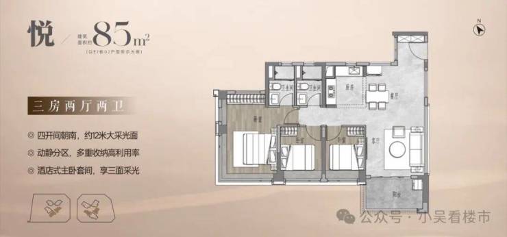 建面85平三房两卫,四开间朝南,客厅开间3.8米,LDKB一体化设计,独立入户玄关,三卧室都是南向,约11米南向采光面。