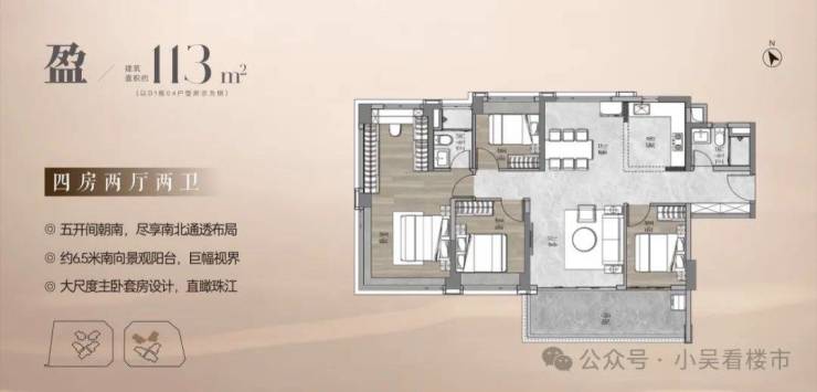 建面113平四房两卫,五开间朝南,约6.5米景观阳台,南北对流户型,主卧可看珠江,还带步入式衣帽间。