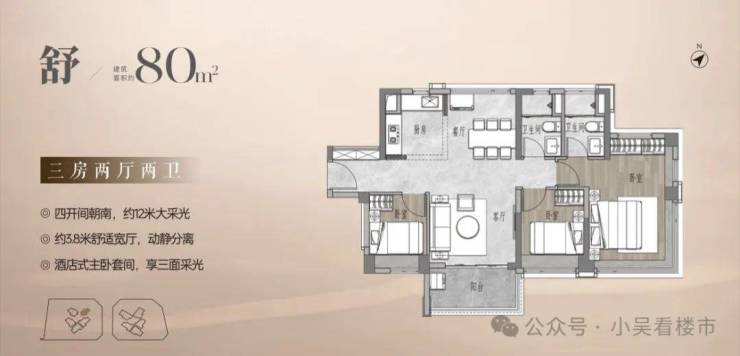 建面80平三房两卫,四开间朝南,约12米南向采光,客厅开间3.8米,主卧套间设计,同样带270度景观飘窗。