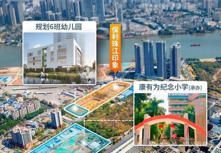 项目自身配建一所6班的幼儿园,西南面有规划的24班小学,目前已确定办学主体为康有为纪念小学,上学非常方便,就在家楼下,附近还有规划的45班完全中学,周边还有荔湾爱莎国际学校,2km内有省实广钢校区第一小学部、省实广钢校区第二小学部、华师附小,3km内有真光实验中学、东沙博雅实验学校。