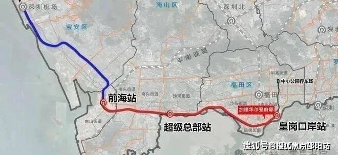 轨道:穗莞深城际轨道2站直达前海,联通两大深港合作区;穗莞深城际(建设中)延长线——穗莞深城际前海至皇岗口岸段设有皇岗口岸站,途径南山、福田等地,建成通车后2站到前海,1站到深圳湾总部基地。
