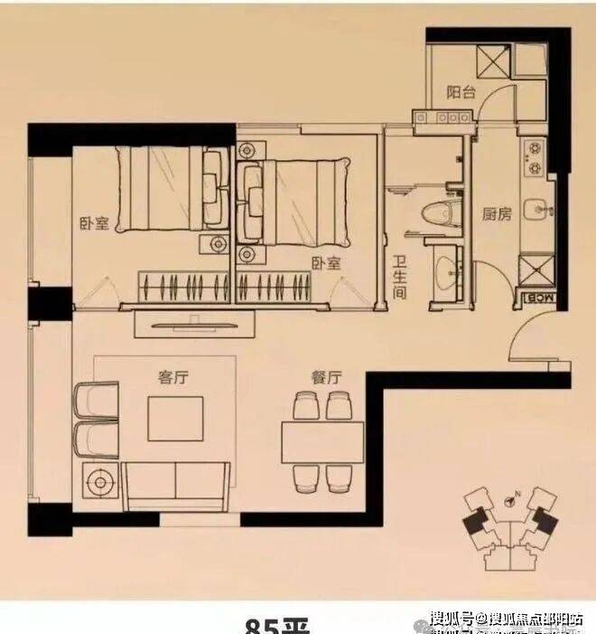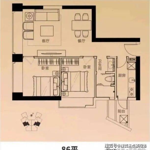建面约86平大两房,南向阳台,阳光主卧,客餐直联,南北通透,空间感好,功能性强,居住体验非常舒适