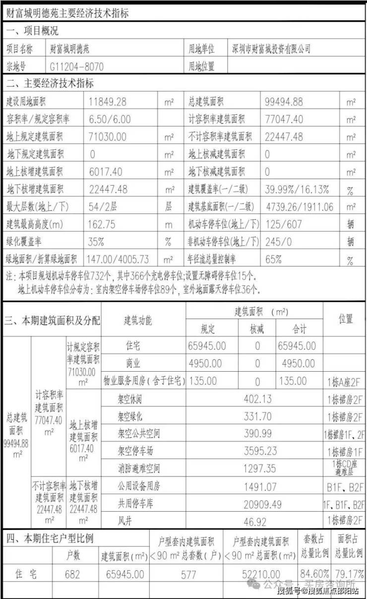 总规划682户,其中户型套内建筑面积<90㎡的有577户,机动停车位607个,非机动车位245个