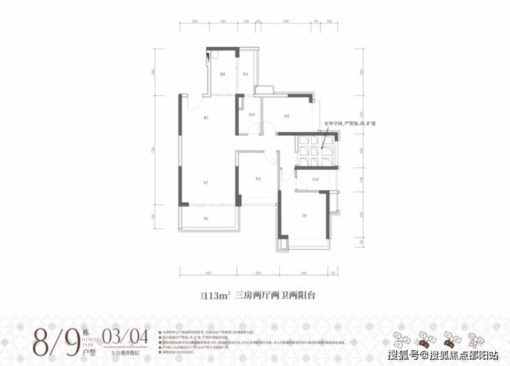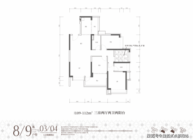 8/9栋03/04户型,建面约109-113㎡,原始结构是三房两厅两阳台,奇数层客厅正出阳台,偶数层客厅侧出阳台,奇数偶数层厨房都有生活阳台,且主卫与次卧之间有一块镂空的地方,搭板并入主卧做书房或者单独做儿童房使用都可以,不能搭的话结构也还说的过去,就是得房率会低一点。