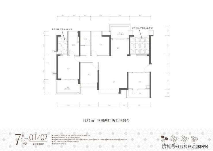 7栋01/02户,建面约137㎡,原始结构是三房两厅两卫两阳台或三阳台,奇数层客厅出阳台,厨房配有一个生活阳台,偶数层餐厅出阳台,主卧和厨房也都配有阳台。奇数偶数层入户玄关处都有一块镂空,搭起来可做房间,即使不搭它的整体户型结构、功能间配比及分布也比较合理。