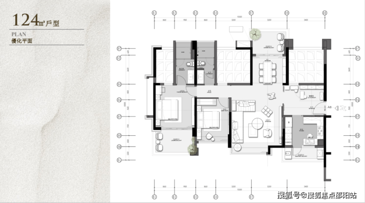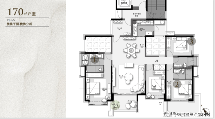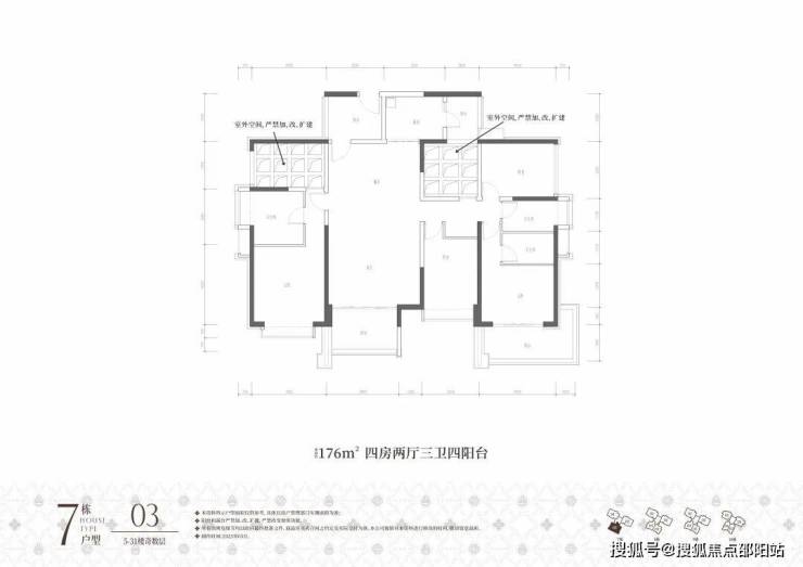 图7栋03户,建面约176㎡,原始结构是四房两厅三卫四阳台,奇数层客厅、主卧、厨房都有阳台,偶数层是主卧、次卧、厨房有阳台。奇数偶数层入户门的阳台可做玄关使用,餐厅左侧镂空处搭起来可做卧室,餐厅右侧搭起来可做书房或儿童房使用,最多可做5+1房使用,可塑性非常强。