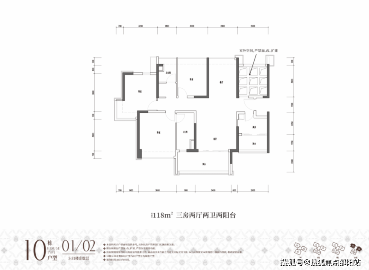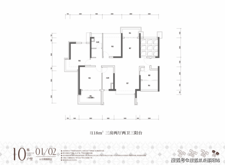 10栋01/02户型,建面约118㎡,原始结构是三房两厅两卫两阳台或三阳台,奇数层是客厅和厨房配有阳台,偶数层是餐厅、主卧和厨房都配有阳台,奇数偶数层入户玄关处都有一块镂空,搭板可以多一个卧室,不能搭的话整体户型结构、功能间配比及分布也还是合理的。
