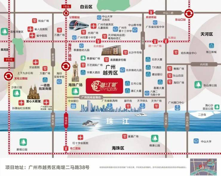 御江苑项目位于南堤二马路西侧,海珠区隔江相望,南 临沿江大道,北临八旗二马路小学小区及太平通津,西侧为广州市第十中学、华侨大厦等,东侧100米即为广州著名文化街区北京路。西、东 面近海珠桥、江湾大桥直通南北,并与天字码头一路相隔。