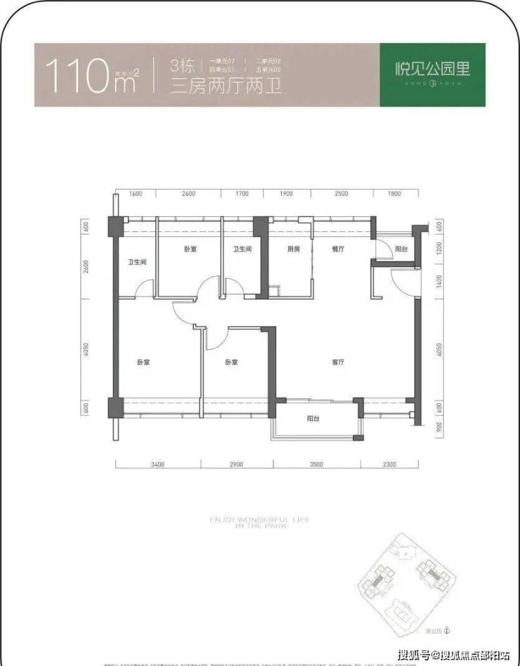 97㎡的3房2厅2卫,仅3栋4单元01户型,设计的是竖厅双龙抱珠格局,客厅3.4米开间,三开间朝南,3个卧室分别做到了3.2米/2.8米/255米的宽度,L型厨房带1个生活阳台,公卫三段式分离,得房率73.61%(不含赠送),东南朝向。