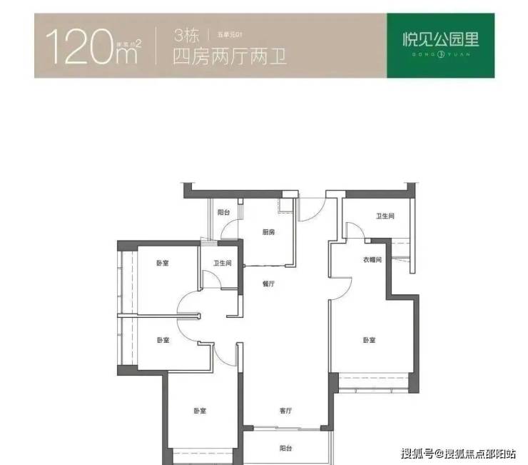 120㎡的4房2厅2卫,仅3栋5单元01户型,设计的是创新式双龙抱珠格局,L型厨房,公卫三段式分离,得房率74.13%(不含赠送),东南朝向。