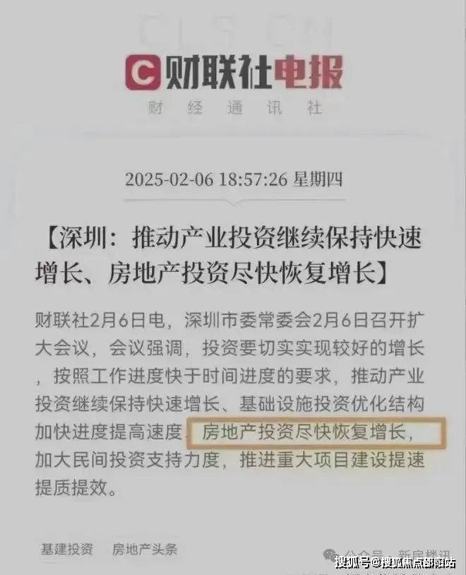 财联社2月6日电,深圳市2月6日召开扩大会议,会议强调,投资要切实实现较好的增长,按照工作进度快于时间进度的要求,推动产业投资继续保持快速增长、基础设施投资优化结构加快进度提高速度、房地产投资尽快恢复增长,加大民间投资支持力度,推进重大项目建设提速提质提效。