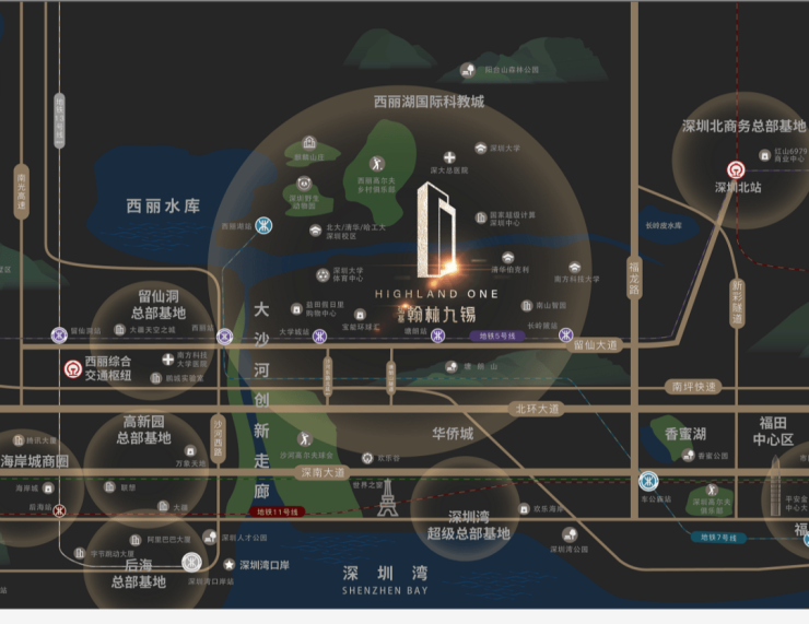 留仙大道正席,紧邻地铁5号线塘朗站,4/5/7号线3轨环绕,毗邻“三纵五横”主干道,瞬息通达全城。西丽高铁站(建设中)、深圳北站两大枢纽环绕,拥有世界交通能级。