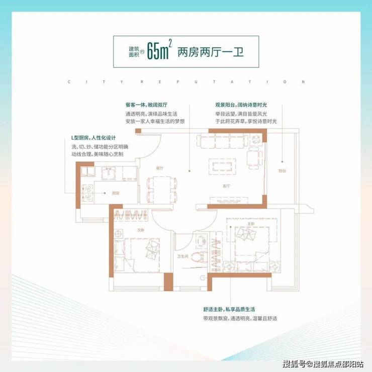 65㎡的2房2厅1卫,设计的是竖厅格局,客厅3.3米开间,LDKB一体化,有赠送入户花园(不在户型图内),L型厨房,卫生间干湿分离,得房率:74.71%(不含赠送),全部朝东向看龙凤路。