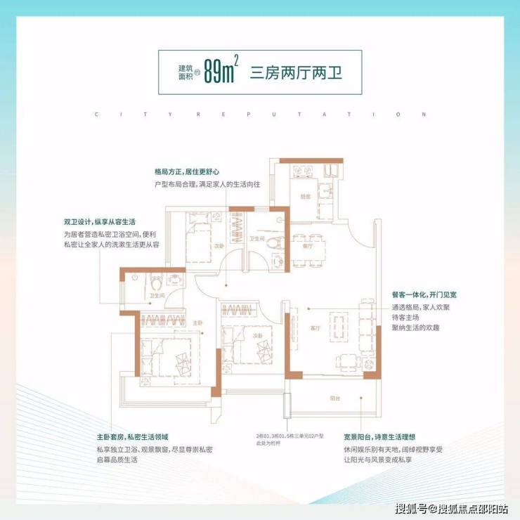 89㎡的3房2厅2卫,5栋02户型,设计的是经典竖厅格局,客厅3.6米开间,LDKB一体化,动静分区,三开间朝南,主卧270°转角飘窗,U型厨房,卫生间干湿分离,得房率:74.71%(不含赠送),西南或东南朝向。