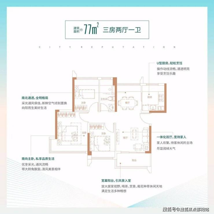 77㎡的3房2厅1卫,1/2栋04户型,设计的是竖厅南北通透格局,客厅3.4米开间,一体化双厅,三开间朝南,主卧270°转角飘窗,U型厨房,卫生间干湿分离,得房率:78.43%(不含赠送),阳台主朝南向。
