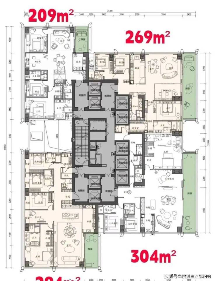 •低区户型(20-30层):主力209㎡三房两厅三卫,部分楼栋分布269㎡四房两厅三卫,格局方正,全明通透,适配高端改善家庭,推窗可赏社区园林与城市中景。