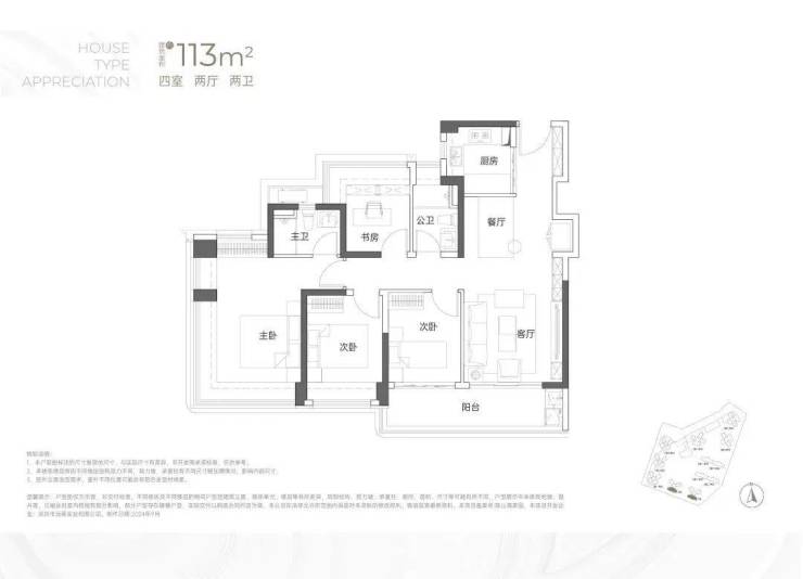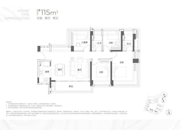竖庭格局,西南向,基本居住功能与建面约108-110㎡4房2卫一致,但格局不一样,从目前公布的户型图上看,主要是主卧空间有了更大的提升,比如可以放更大一点的衣柜。但从位置上看,它所在的楼栋更靠近主干道,会有噪音影响。建面约115㎡4房2卫