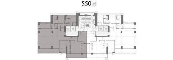 面积约550㎡四房,1号楼高区四房户型,独梯入户对景玄关,超展开主卧,功能齐全;公私区双阳台,270°无敌视野;沉浸式展廊,彰显主人风采,还配有酒吧、茶吧以及超尺度方厅最大化满足社交需求,可以说是平层“豪宅”。