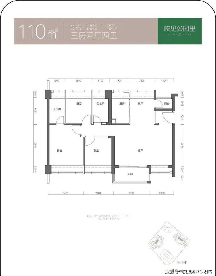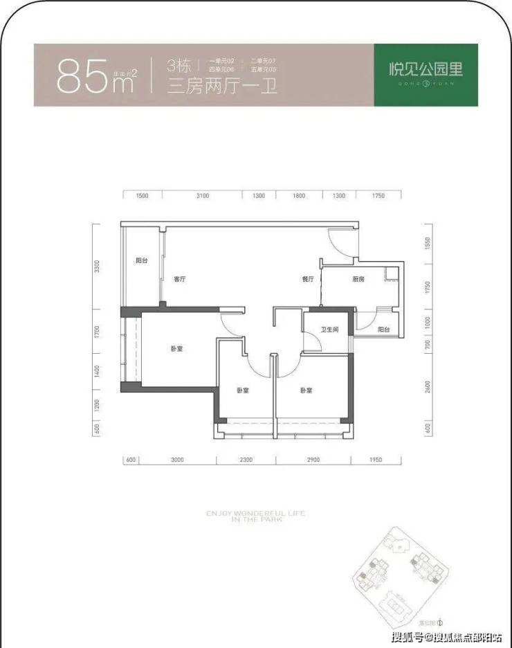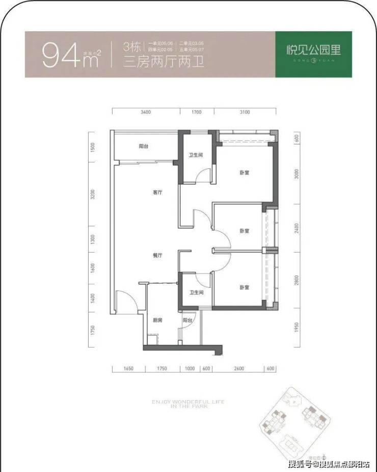 面积有85-88㎡的3房2厅1卫,91-94-95-97-110㎡的3房2厅2卫,120㎡的4房2厅2卫户型