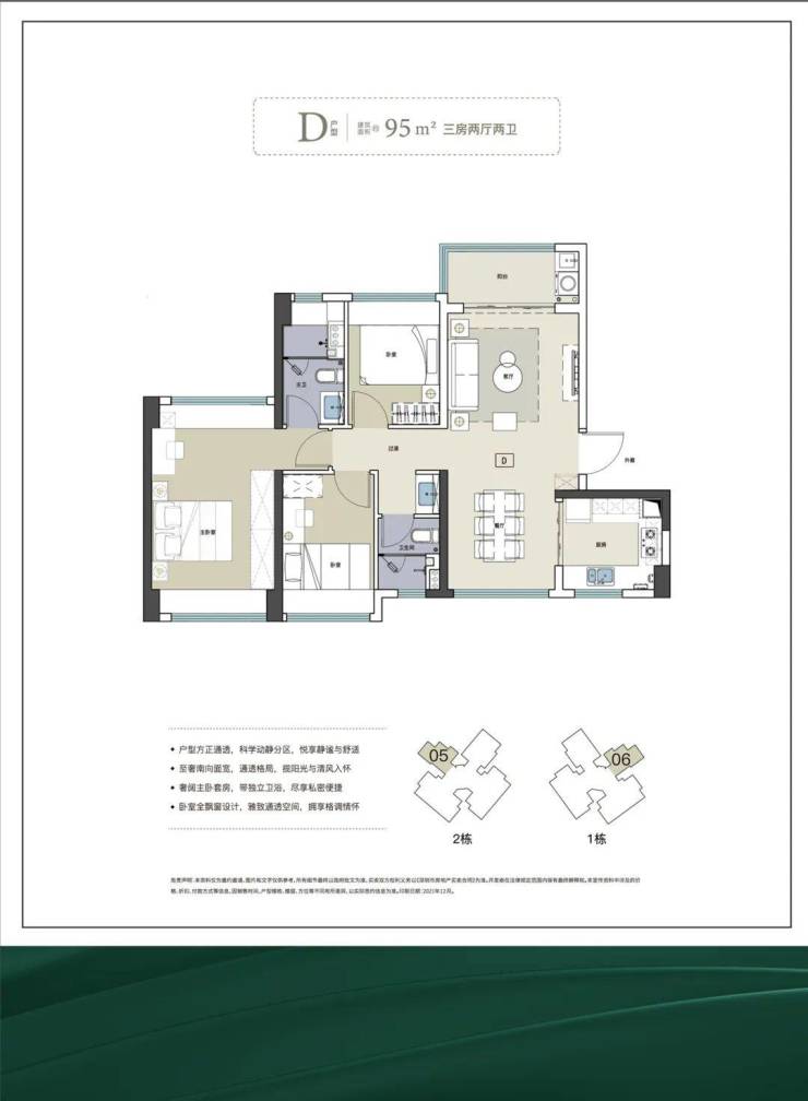 该面积段一共有C和D两个户型,其中C户型为B户型的放大版,多出了一个卫生间,其他功能区相对更加宽敞;D户型在设计上更优,双厅更加通透,厨房和餐厅空间更加宽敞舒适,主卧更是双面采光,市场少有,堪称惊艳。
