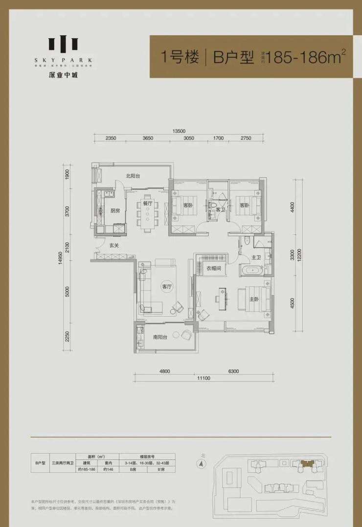 套内面积约146平,动静分区户型,南北通透双阳台,北向看香蜜公园景观