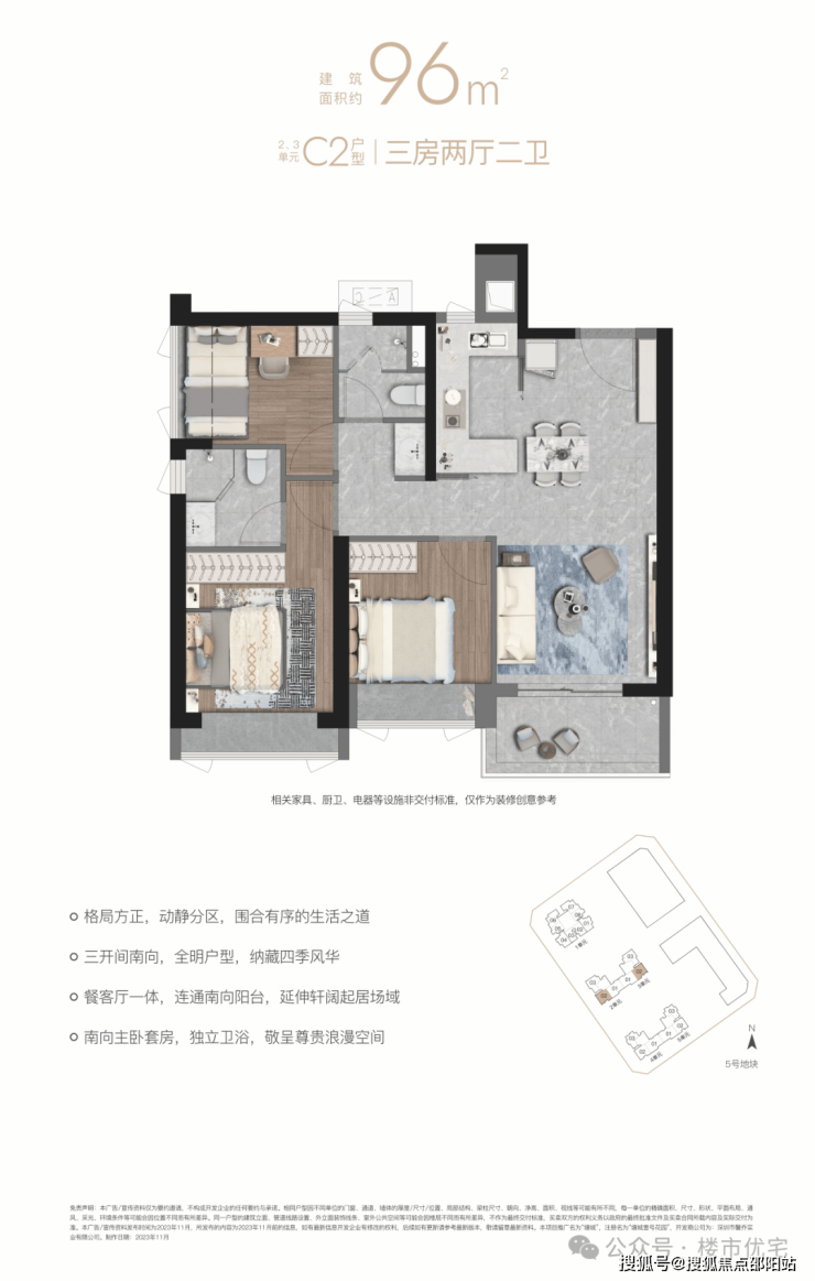 “10.7 m纵深紧凑南向三房”,10.7 m纵深餐客一体,通风采光极佳